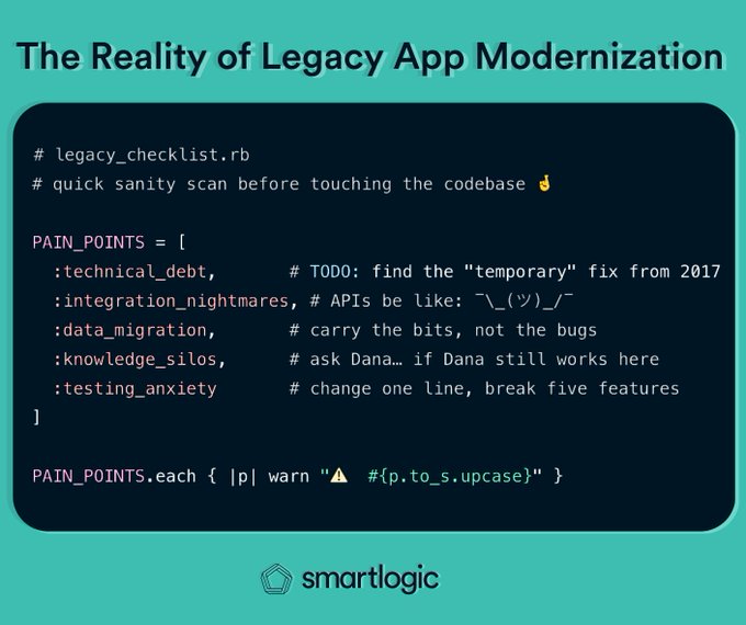 @smartlogic Modernizing a legacy Rails app isn’t just swapping libraries, it’s detangling years of “temporary” fixes, jQuery & mystery plugins. SmartLogic engineer Emma Whamond shares how she used AI to tackle a Rails 7 upgrade + what it means for devs: https://t.co/PUU8p57dS3 #webuff.ly/IOkQtyYU8p57dS3 #webDxiYWx2q